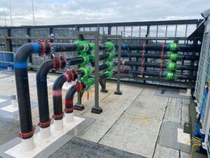 Our detailing and prefabrication team did an amazing job of prefabricating Air Source Heat Pump skids to support the laboratory-specific central plants. The prefabrication allowed us to minimize time on site and control our working conditions. The finished install balances space savings with efficient maintenance and part replacement.