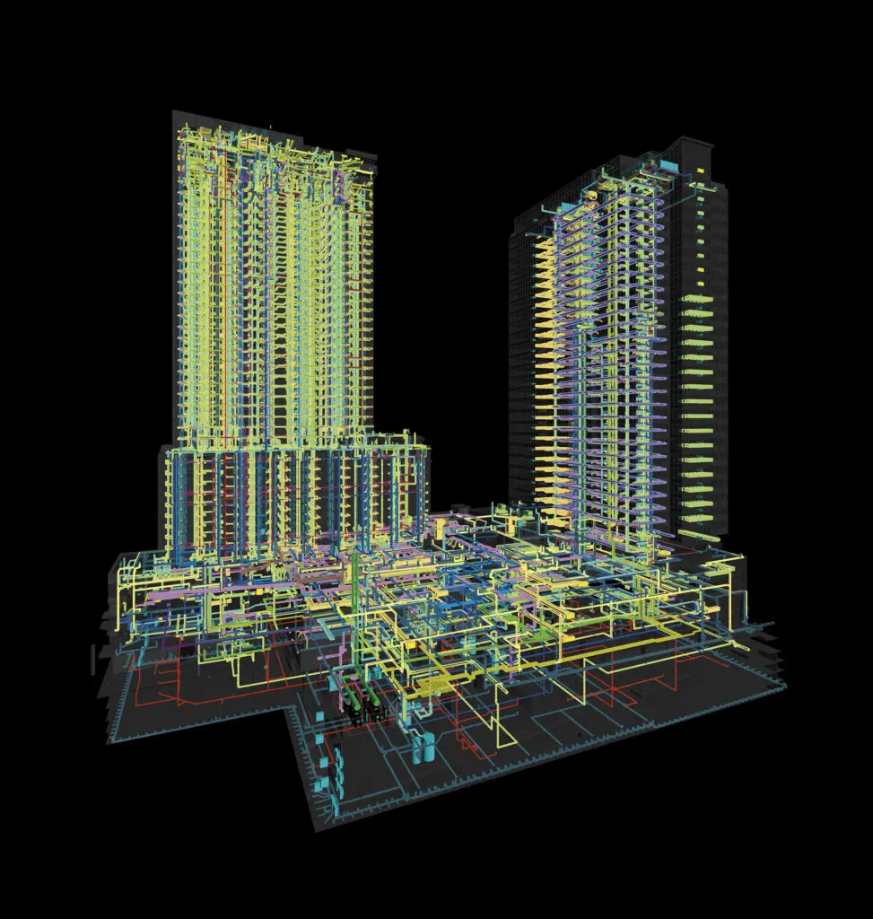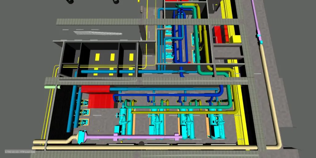 The central plant consists of (4) 750-ton centrifugal water chillers that are interconnected with the 3,000-ton cooling tower located at the top of the office tower structure. These systems are connected via 18” carbon steel condenser water piping with (2) 100 horsepower pumps moving thousands of gallons of condenser water several hundred feet between these massive pieces of equipment. The chilled water distributes to the podium and towers via a network of pumps and thousands of feet of carbon steel and copper piping serving a range of air handlers, fan coil units, water source heat pumps and compressor racks. This central plant provides enough cooling to serve the needs of 13 commercial kitchens and restaurants, 120,000 SF of retail and common areas, 227 hotel rooms, 220 residential apartments and over 700,000 SF of office tower space. This facility will serve the cooling needs of over 6,000 people and a total of 1.6 million SF.