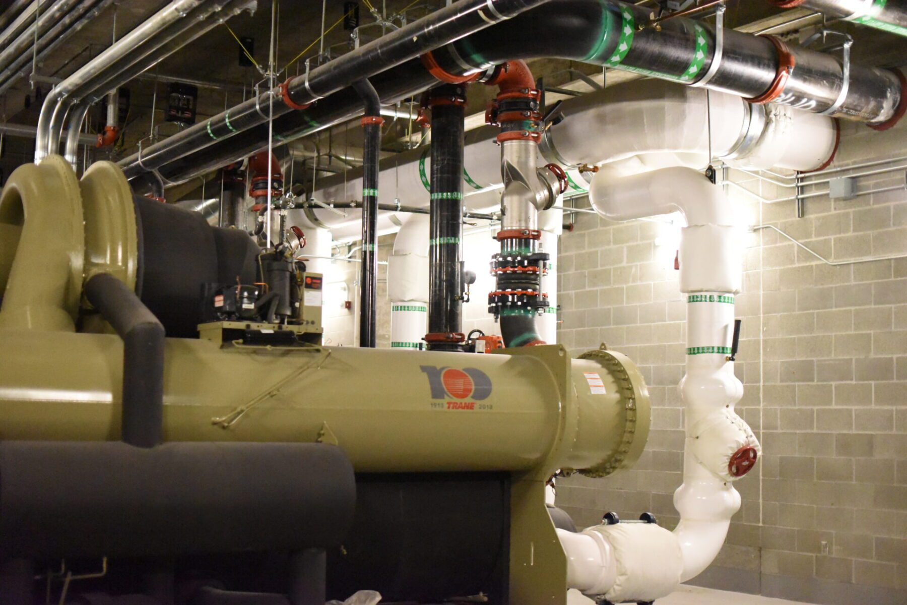 The central plant consists of (4) 750-ton centrifugal water chillers that are interconnected with the 3,000-ton cooling tower located at the top of the office tower structure. These systems are connected via 18” carbon steel condenser water piping with (2) 100 horsepower pumps moving thousands of gallons of condenser water several hundred feet between these massive pieces of equipment. The chilled water distributes to the podium and towers via a network of pumps and thousands of feet of carbon steel and copper piping serving a range of air handlers, fan coil units, water source heat pumps and compressor racks. This central plant provides enough cooling to serve the needs of 13 commercial kitchens and restaurants, 120,000 SF of retail and common areas, 227 hotel rooms, 220 residential apartments and over 700,000 SF of office tower space. This facility will serve the cooling needs of over 6,000 people and a total of 1.6 million SF.