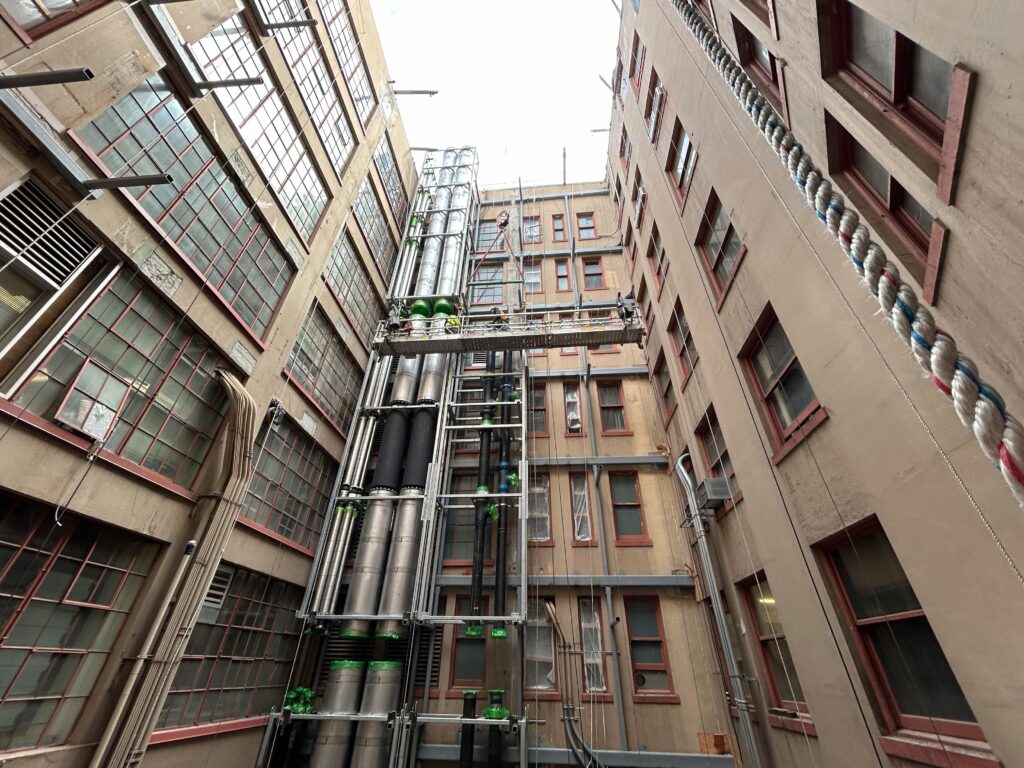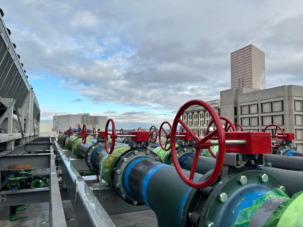 MacDonald-Miller has been selected to build and install a comprehensive chilled water system designed to feed 16 computer room air handlers and three 36-ton rooftop chillers. This upgrade will also include a custom-fabricated lightwell rack to support the building’s critical systems. In addition to these features, the upgraded infrastructure will host a generator and cooling system capable of providing up to 7 MW of power during an outage, ensuring reliability and safety for all occupants.