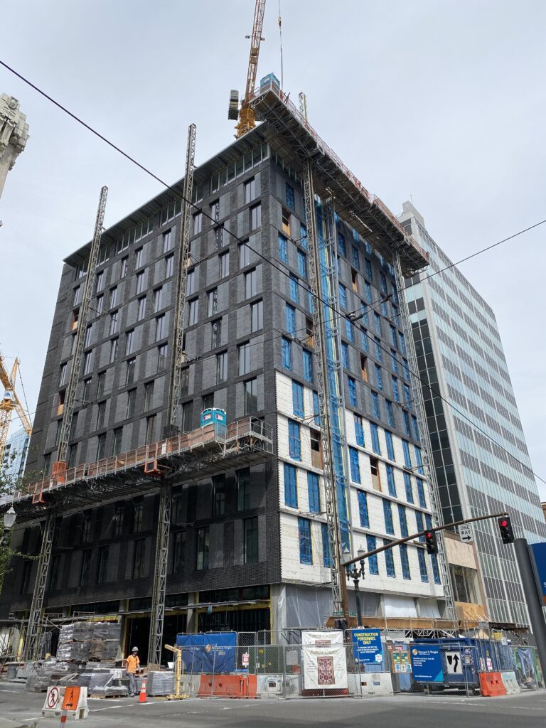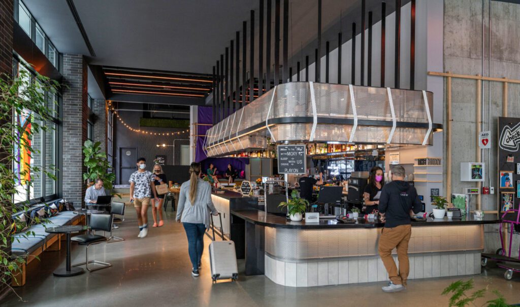 The Moxy Hotel is a 12-story, 74,000 SF tower featuring 197 guest rooms, a hospitality suite, and an outdoor public patio at the roof level. The development also includes approximately 12,600 SF of amenity and back-of-house space across the main and basement levels, along with ground-floor retail that activates the surrounding urban streetscape. MacDonald-Miller provided full mechanical and plumbing design-build services, delivering efficient, coordinated systems within a compact and vertically constrained footprint: